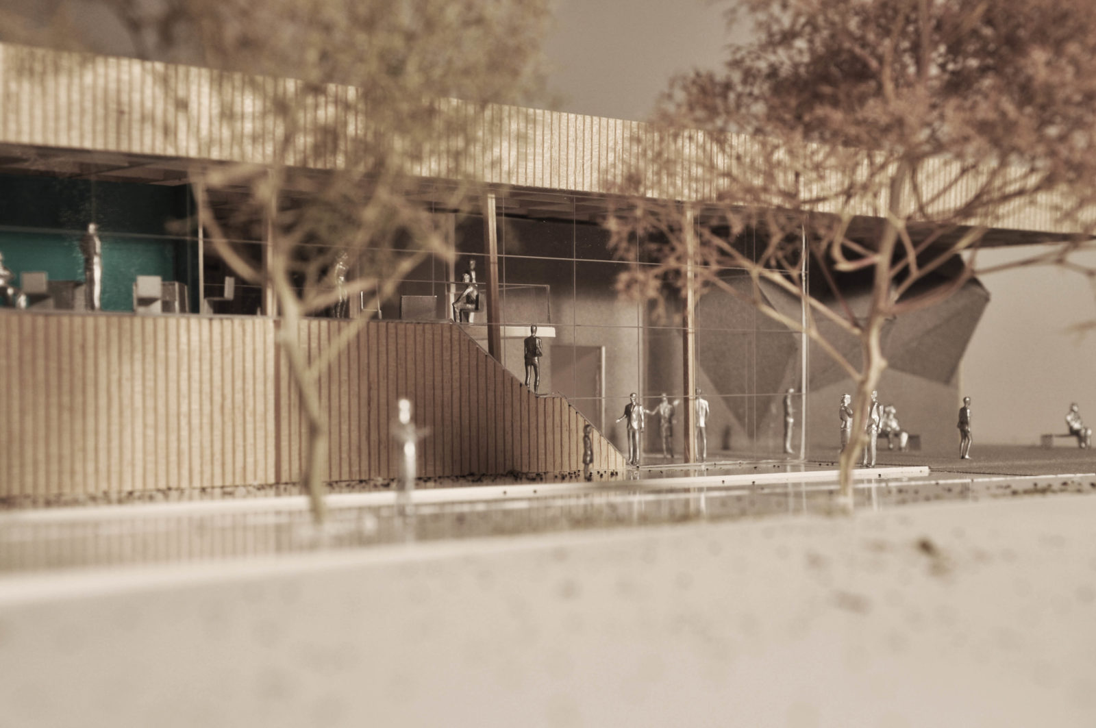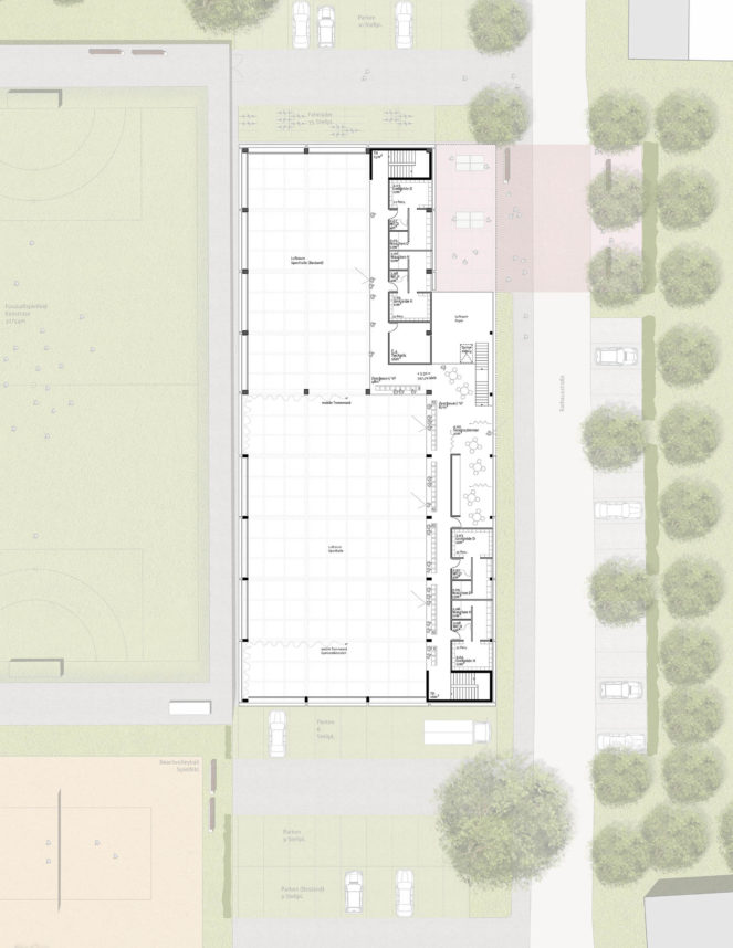 Die Bestandshalle wird in südlich durch die neue Sporthalle erweitert. Bestand und Neubau werden durch ein gemeinsames Flachdach vereint. Ein großzügiger Gebäudeeinschnitt unter dem weit auskragendem Dach ermöglicht den Besuchern den Zugang zum gemeinsamen Foyer beider Sporthallen.